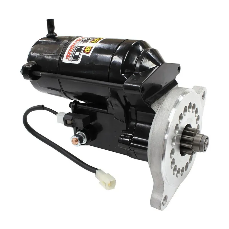 Aeroflow high torque starter motors are serviceable and manufactured from aluminium with a multi-angle mounting block that allows different mounting positions to clear multiple header and oil pan configurations. The 1.4kw / 1.9hp starter is recommended for engines up to 400cu and 14:1 compression ratio and utilizes a 4.44:1 gear reduction. Aeroflow starter motors have high heat resistance and are powdercoated black for extra corrosion protection.