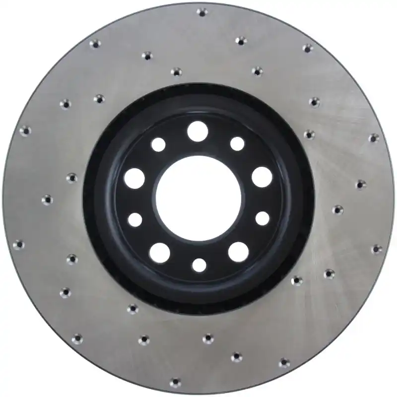 StopTech Drilled Sport Rotors are 1-piece direct replacement brake discs for factory brake systems and stock calipers that look great behind your wheels – and offer significantly improved braking performance. The unique cross-drilling aids with heat and brake dust dispersal; prevents glazing of the pads; adds bite and improves wet and dry braking performance. Built to last; the black e-coating provides protection from corrosion and the high carbon metallurgy (in most applications) offers quieter operation; better crack resistance and increased performance.