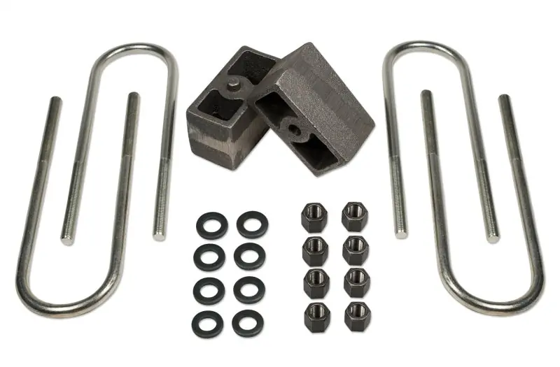 Tuff Country’s block and u-bolts kits are an economical solution to raising the rear end of many trucks and SUVs. Lift blocks are inserted between the factory axle and leaf spring to lift the rear end. Each kit includes lift blocks and extended zinc plated u-bolts, custom fit for the application.