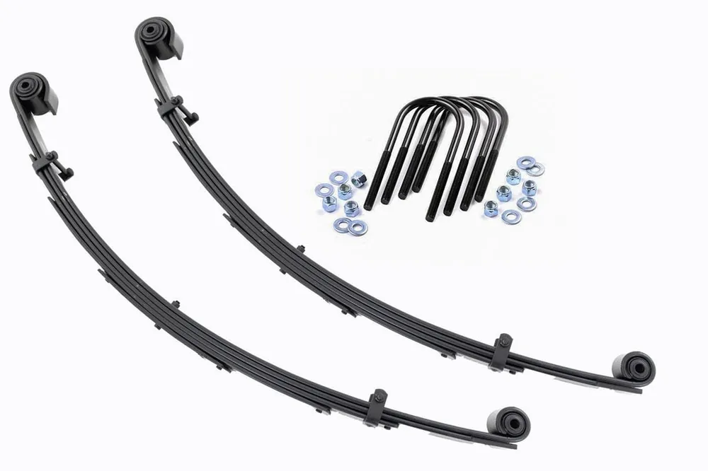 Durable and Off-Road Ready. Rough Country’s Replacement Leaf Springs are designed to tackle any terrain that they are faced with. Featuring a multi-leaf design and spring pads this reduces the friction and maximizes comfort. Each leaf pack utilizes tapered leaves for improved flexibility at their ends.