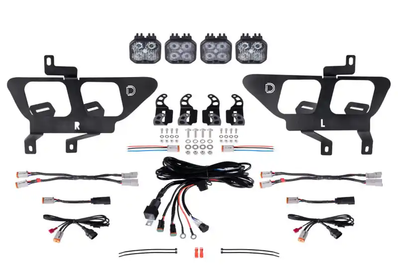 FeaturesBolt-on fitment compatible with FordF-150 2021-2023.Adds SAE-compliant fog lightsand powerful offroad lighting.Harnesses included for independent control of road-legal and offroad lighting.Backlight feature provides amber accent light.Highly durable powdercoated stainless steel bracket.Engineered and assembled in USA.Overview. The Stage Series Fog Pocket Kit compatible with FordF-150 2021-2023 from Diode Dynamics allows you to mount four SS3 LED Pods in the factory bumper openings. This kit adds some serious functionality to your Bronco with both road-legal fog lights and powerful offroad lighting. This kit includes application-specific brackets that were CAD-designed to install using factory mounting points. No cutting or drilling required!Lighting for Every Situation. This kit includes two SS3 LED Pods in the SAE-compliant fog beam pattern and two SS3 LED pods in the combo beam pattern. This combination gives you different options whether you are on or offroad. All options use high-intensity LED emittersand TIR optics for unmatched focus and overall output.Independent Control.With the included harness and adaptersthe two SS3 Fog pods and two SS3 offroad pods in this kit can be controlled independentlyallowing you to switch between road-legal fog lights and offroad lights with ease. The included H10-size or Molex adapters connect the SS3 fog pods to your factory halogen or LED fog light connecterwhile the off-road lights in this kit are controlled with either the included 3-way toggle switchor a factory-installed aux switch.SAE Compliant. When installed as a pair and aimed in accordance with your state’s regulationsthe Fog pattern meets SAE J583 standard as a Foglampfor legal on-road use.