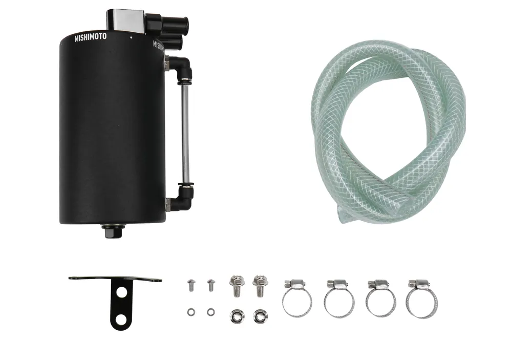 Over time harmful oil will build up inside the turbocharger, intake manifold, intercooler and piping. A Mishimoto Oil Catch Can will prevent this from happening while its all black finish will add a touch of style to your engine bay.