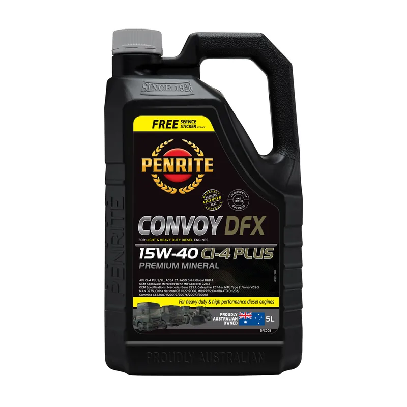 Convoy DFX is a mineral, SAE 15W-40, FULL ZINC, mid ash, diesel engine oil made from pure hydrocracked base oils and an advanced anti-wear additive system for complete engine protection.Licensed by the API (American Petroleum Institute) to meet CI-4 Plus and CI-4 specifications ensuring quality and satisfaction. It also exceeds European ACEA E7 as well as many other manufacturer’s specifications.Click here to viewClick Here to view API LicenseAPPLICATIONConvoy DFX is designed for use in 4, 6 & 8+ cylinder multi cam, naturally aspirated, supercharged, turbocharged common rail & direct injection diesel engines. It is designed predominantly for use in four stroke heavy duty diesel engines. It can be used in both on and off-highway applications, high speed and some medium speed diesel engines used in marine environments as well as for generator sets and agricultural equipment.Convoy DFX is recommended for use in vehicles where SAE 15W-40 or SAE 20W-40 engine oils were originally recommended by the manufacturer.Convoy DFX can be used in diesel engines where ACEA E7 or where API CI-4 Plus or CI-4 heavy duty engine oils are specified by the manufacturer. It can also be used where ACEA A3/B3 is recommended in model years prior to 2017 and where previous API specifications API CH-4, CG-4 or CF-4 is specified. It is suitable for use in many mixed fleets with older Petrol and LPG powered vehicles requiring an engine oil meeting API SL (2001-2004), API SJ (1998-2000), API SH (1994-1997) or API SG (1989-1993).Convoy DFX is NOT recommended for use in diesels fitted with a DPF (Diesel Particulate Filter) that require an ACEA “C” grade Low-Mid SAPS (Sulphated Ash, Phosphorus & Sulphur) engine oil. We recommend checking the recommendation guide for the correct grade and specification.VEHICLE & FUEL TYPESConvoy DFX is suitable for use in diesel engines in passenger cars, 4WD’s, light & heavy duty commercial engines in trucks, tractors, agricultural & earthmoving equipment as well as industrial equipment such as fork lifts & stationary engines. It can also be used with Petrol/E10/LPG (Dual Fuel). It is also suitable for use in petrol and LPG engines as a mixed fleet oil and can be used in motorcycles with wet clutches.Please Note -Engines requiring later oil performance specifications should use Convoy DHD or Convoy DLA. Those with oil consumption problems (non EPA-04 engines) should use HPR Diesel SAE 20W-60.Convoy DFX replaces Diesel FX