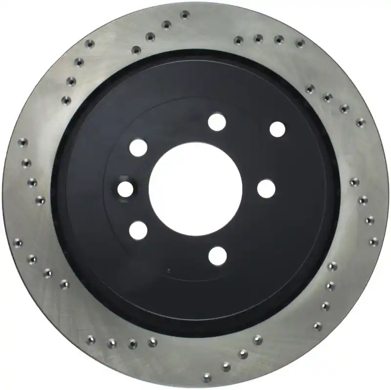 StopTech Drilled Sport Rotors are 1-piece direct replacement brake discs for factory brake systems and stock calipers that look great behind your wheels – and offer significantly improved braking performance. The unique cross-drilling aids with heat and brake dust dispersal; prevents glazing of the pads; adds bite and improves wet and dry braking performance. Built to last; the black e-coating provides protection from corrosion and the high carbon metallurgy (in most applications) offers quieter operation; better crack resistance and increased performance.