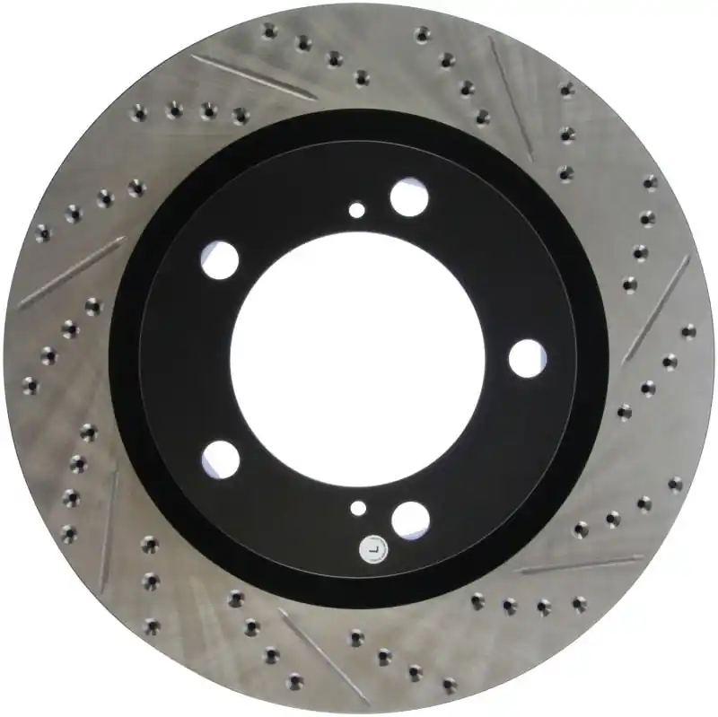 StopTech Drilled and Slotted Sport Rotors are 1-piece direct replacement brake discs for factory brake systems and stock calipers that look great behind your wheels – and offer significantly improved braking performance. The unique cross-drilling and slotting aids with heat and brake dust dispersal; prevents glazing of the pads; adds bite and improves wet and dry braking performance. Built to last; the black e-coating provides protection from corrosion and the high carbon metallurgy (in most applications) offers quieter operation; better crack resistance and increased performance.