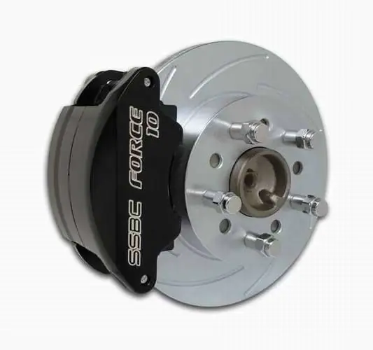 Disc brake conversion kit for GM 10&12 bolt rear ends with staggered or non-staggered shocks & C-clip or non C-clip axles. Force 10 SuperTwin caliper & 11.25″ rotor.