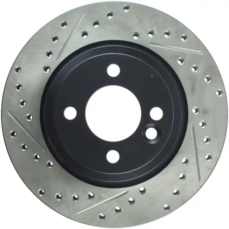 StopTech Drilled and Slotted Sport Rotors are 1-piece direct replacement brake discs for factory brake systems and stock calipers that look great behind your wheels – and offer significantly improved braking performance. The unique cross-drilling and slotting aids with heat and brake dust dispersal; prevents glazing of the pads; adds bite and improves wet and dry braking performance. Built to last; the black e-coating provides protection from corrosion and the high carbon metallurgy (in most applications) offers quieter operation; better crack resistance and increased performance.