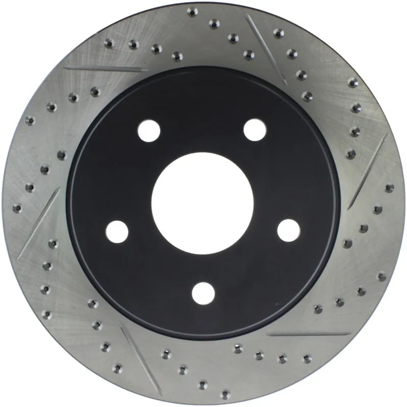 StopTech Drilled and Slotted Sport Rotors are 1-piece direct replacement brake discs for factory brake systems and stock calipers that look great behind your wheels – and offer significantly improved braking performance. The unique cross-drilling and slotting aids with heat and brake dust dispersal; prevents glazing of the pads; adds bite and improves wet and dry braking performance. Built to last; the black e-coating provides protection from corrosion and the high carbon metallurgy (in most applications) offers quieter operation; better crack resistance and increased performance.